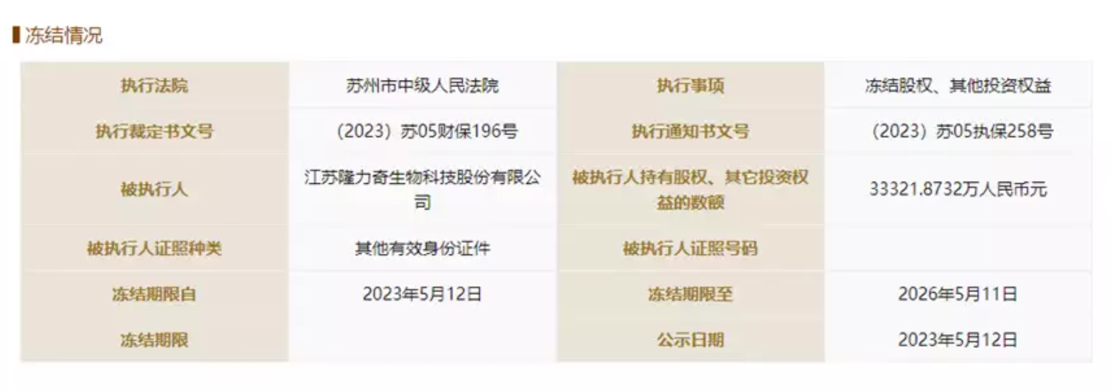 6月14日消息,近日,江苏隆力奇生物科技股份有限公司(以下简称“隆力奇”)新增一则股权冻结信息,股权被执行企业为隆力奇子公司克劳丽化妆品股份有限公司,冻结股权数额约3.33亿元,执行法院为苏州市中级人民法院。