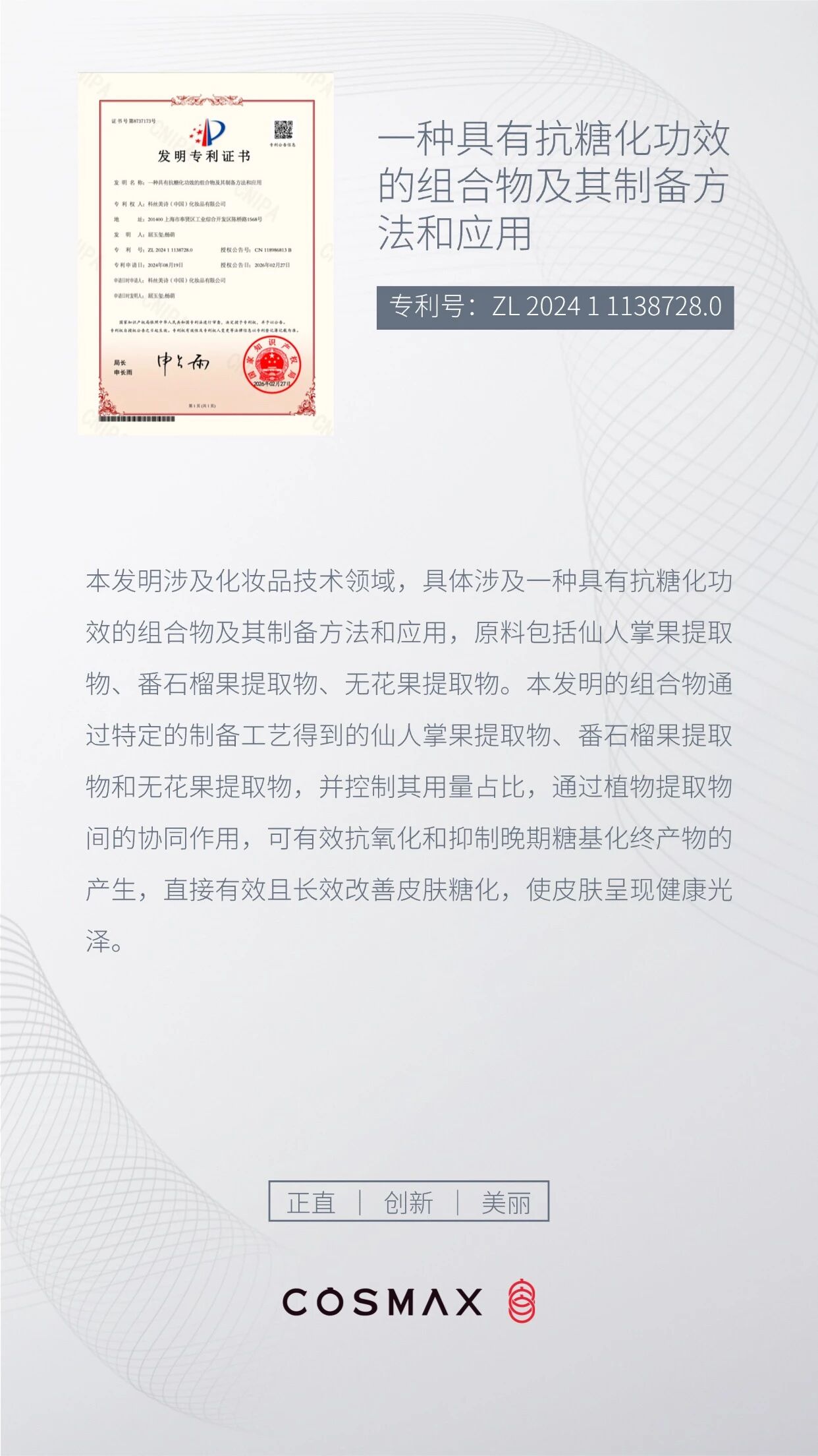 近日,国际化妆品代工厂科丝美诗(中国)化妆品有限公司,正式获得国家知识产权局授权的抗糖化功效新发明专利(专利号:ZL 2024 1 1138728.0),为美妆抗衰赛道再添植物协同抗糖新方案。该专利聚焦「植物复配抗糖化」,核心原料为仙人掌果提取物、番石榴果提取物与无花果提取物三种天然植物成分,通过特定制备工艺控量配比,实现成分协同作用:不仅可清除自由基抗氧化,更能直接抑制晚期糖基化终产物(AGEs,也就是糖化过程损伤皮肤的核心产物)生成,可长效改善皮肤糖化问题,帮助肌肤维持健康光泽。