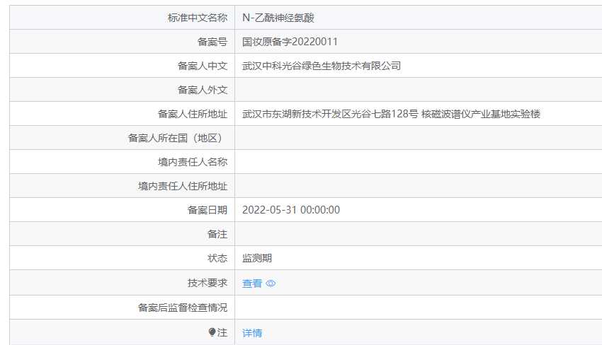 原料技术要求显示,该原料是通过发酵的生物技术来源,以葡萄糖、玉米浆为原料,经大肠埃希氏菌(Escherichia coli)(菌株号:CASOV-09)经发酵、过滤、灭菌、水解、提纯、烘干、粉碎、筛分的步骤得到纯度98%以上的N-乙酰神经氨酸结晶产品。
