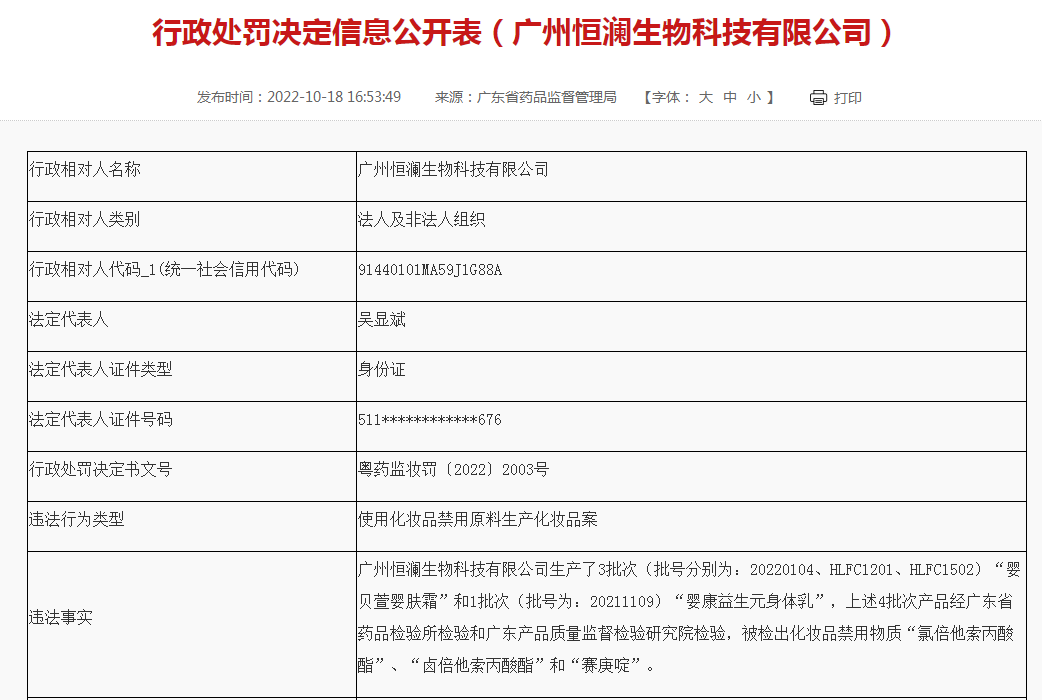 10月18日,广东药监局发布行政处罚信息,广州恒澜生物科技有限公司由于在儿童化妆品中被检出禁用物质“氯倍他索丙酸酯”等,且金额较大,企业、法定代表人以及生产负责人三方都被禁业。
