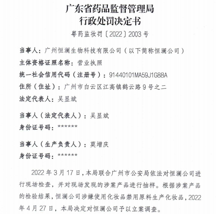 鉴于广州恒澜在儿童化妆品中使用禁用化妆品原料,且金额较高,该企业最终被吊销化妆品生产许可证、取消化妆品产品备案以及禁业10年。与此同时,广州恒澜企业法定代表人吴显斌和生产负责人曾某也被处以终身禁业,不得从事化妆品生产经营活动。