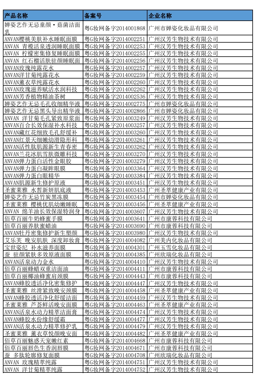 根据“广州市未提交年度报告的备案产品清单”列表显示,该清单共有3688页,按照每页的产品数量约为45个计算,也就是说有17万普通化妆品因未提交年报被取消备案。美妆头条记者发现,“中招”的产品涉及多个品类,包含面膜、精华、面霜、洗发水等多品类产品。