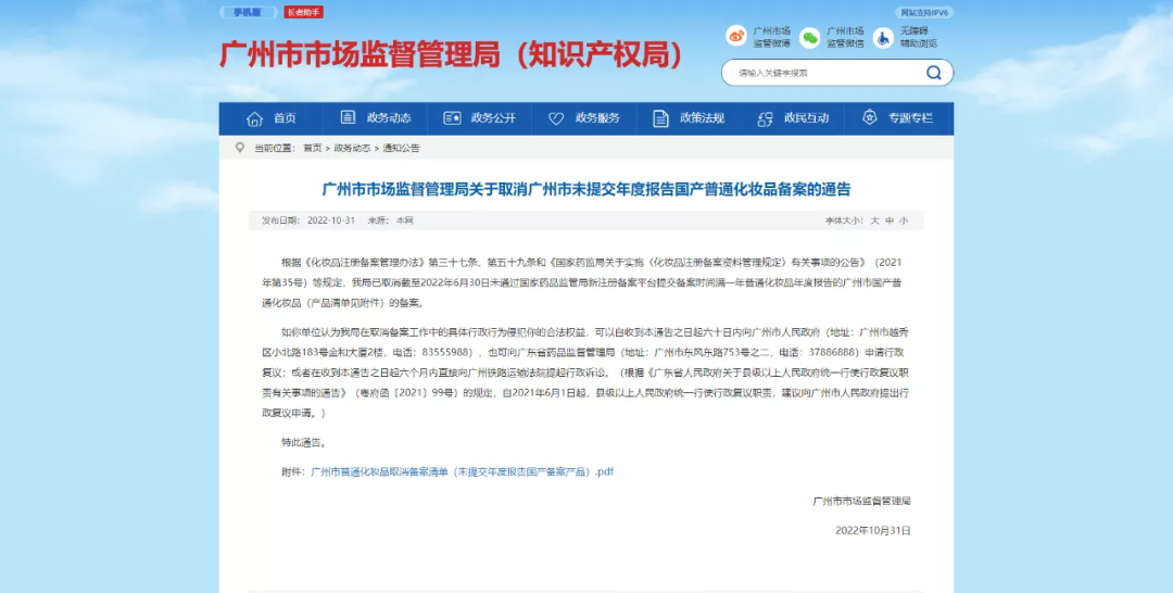 昨天(10月31日),广州市市场监督管理局发布关于取消广州市未提交年度报告国产普通化妆品备案的通告。