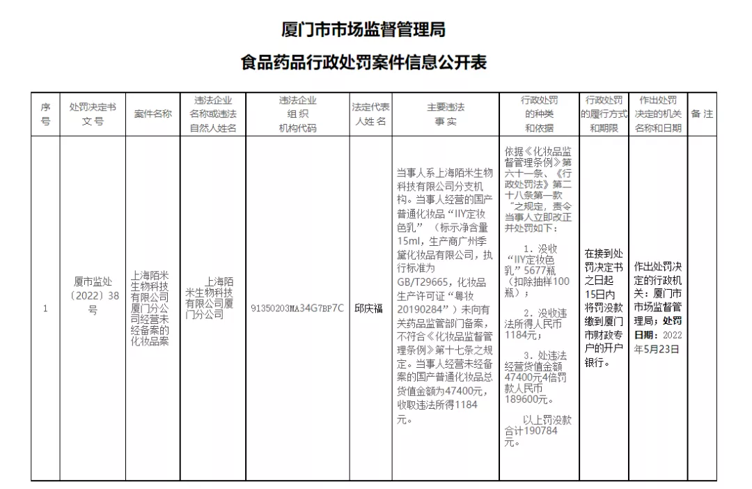 上海陌米生物科技有限公司厦门分公司经营的国产普通化妆品“IIY定妆色乳”就因未向有关药品监管部门备案被没收产品,处违法经营货值金额47400元4倍罚款人民币189600元,罚没款合计190784元。苏州艾尼斯教育科技有限公司上海浦东分公司因上市销售、经营或者进口未备案且无中文标签的普通化妆品,被罚23.05065万元。贵州博诗雅科技有限公司因上市销售未备案普通化妆品,被处罚没款68756元。