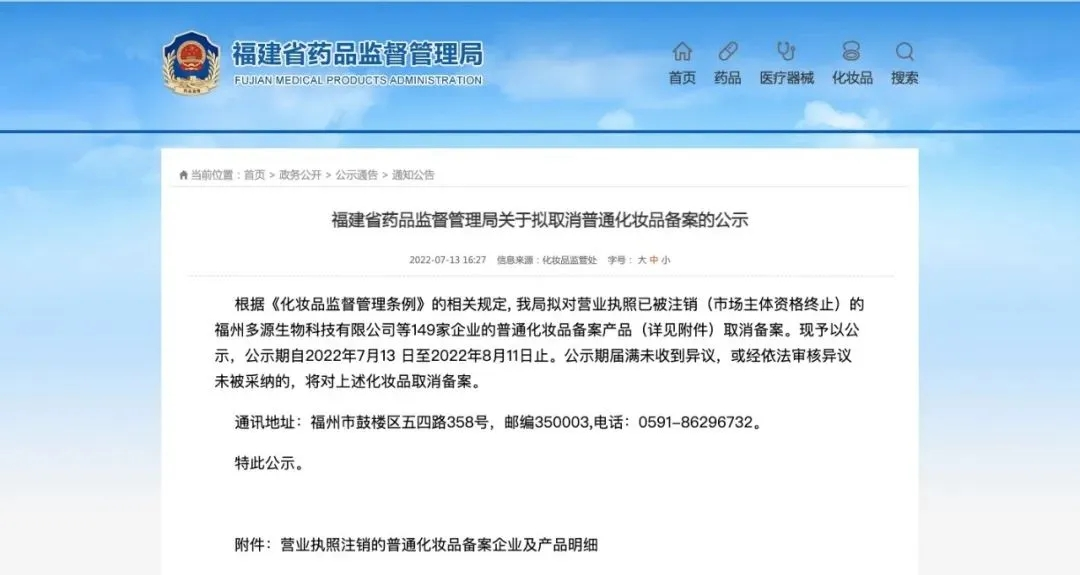 比如,福建省药品监督管理局就曾公示一批被取消备案的普通化妆品,涉及149家企业的898个产品。公告称,该149家企业均为营业执照已被注销(市场主体资格终止)的企业,898个产品则都是“僵尸”产品。江西省下辖3个市(鹰潭、抚州、吉安)市场监督管理局也陆续公示了一批拟取消普通化妆品备案名单,共涉及231款产品。其中不乏一些企业已倒闭、注销。