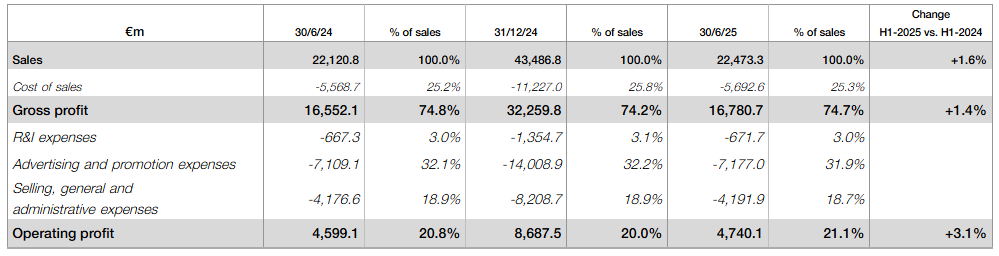 根据数据显示,2025年1-6月,欧莱雅集团销售额达到224.7亿欧元(约合人民币1863.59亿元),同比增长3.0%(调整后增长3.2%),合并增长1.6%;营业利润约47.4亿欧元(约合人民币393.39亿元),同比增长3.1%;净利润(不含非经常性项目)37.83亿欧元(约合人民币313.91亿元),同比增长 1.0%。