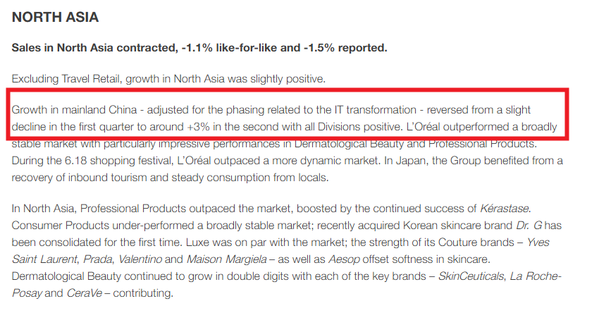 欧莱雅集团表示,不包括旅游零售,北亚地区略有增长。