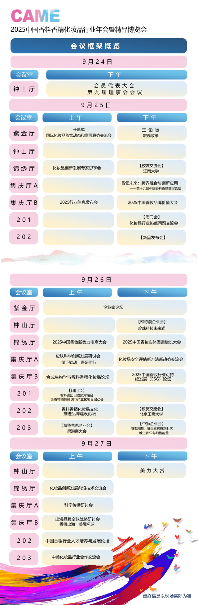 2025年中国香料香精化妆品行业年会暨精品博览会将于9月25 -27日在江苏南京召开。大会以“科技 品牌 共进”为主题,坚持“高品质、高规格、高精尖”标准,突出“专业化、精品化、国际化”特色,汇聚国内外知名企业、专家学者和行业精英,搭建“产学研销”深度融合的交流与合作平台,助力中国香妆产业打造全球创新高地,培养新质生产力。