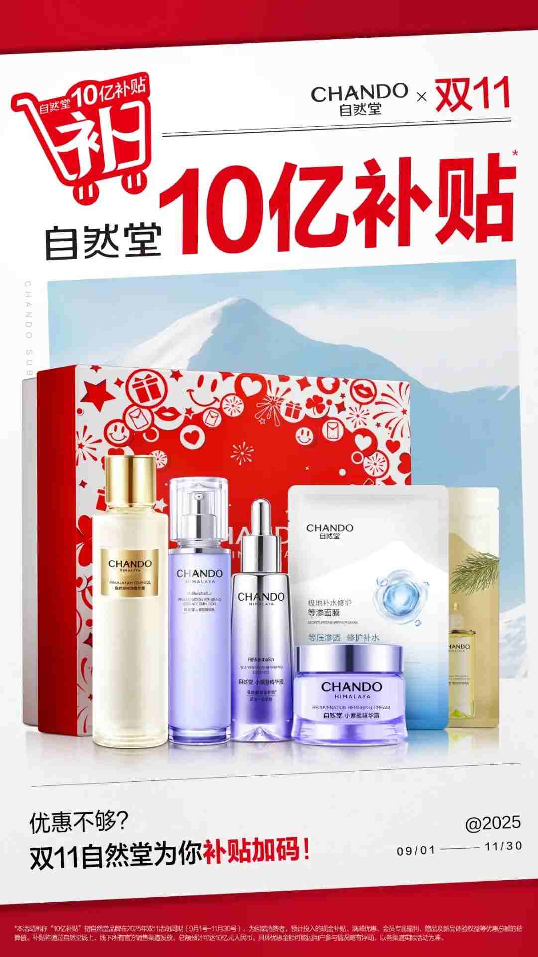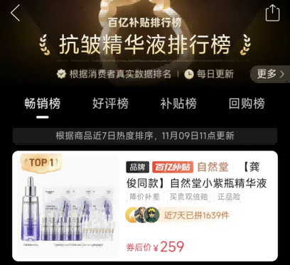 通俗来讲,在双11期间,自然堂投入的现金补贴、满减优惠、会员专属福利、赠品及新品体验权益等优惠总额,估算预计可达10亿元人民币。补贴优惠覆盖多品类,新品、爆品和囤货品均享补贴价。