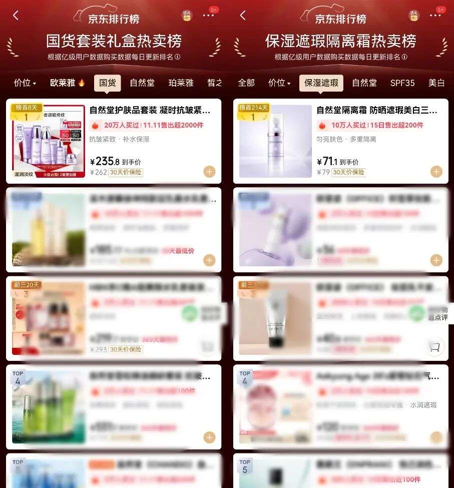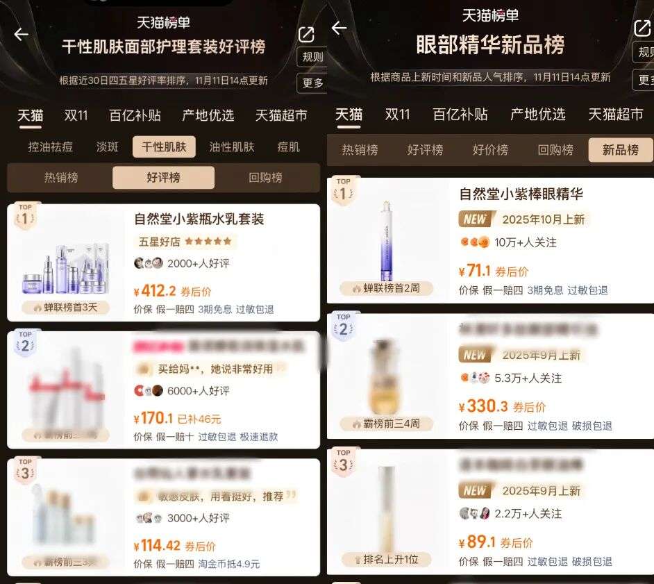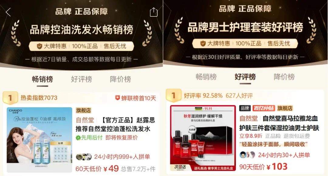 自然堂,双11各业态全面开花,线上霸榜多平台销售榜单,线下核心业态销售同比涨幅均超50%,且占据多个系统的品牌及品类销售排名TOP1!