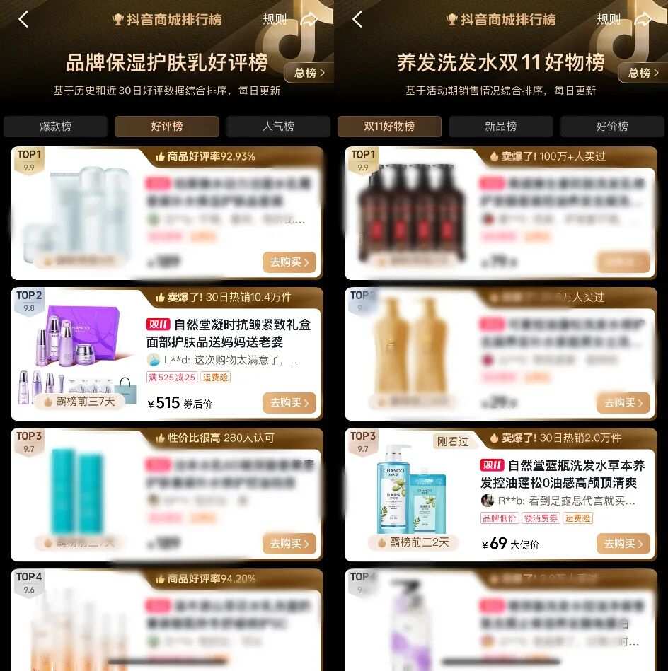 各平台部分榜单截图
