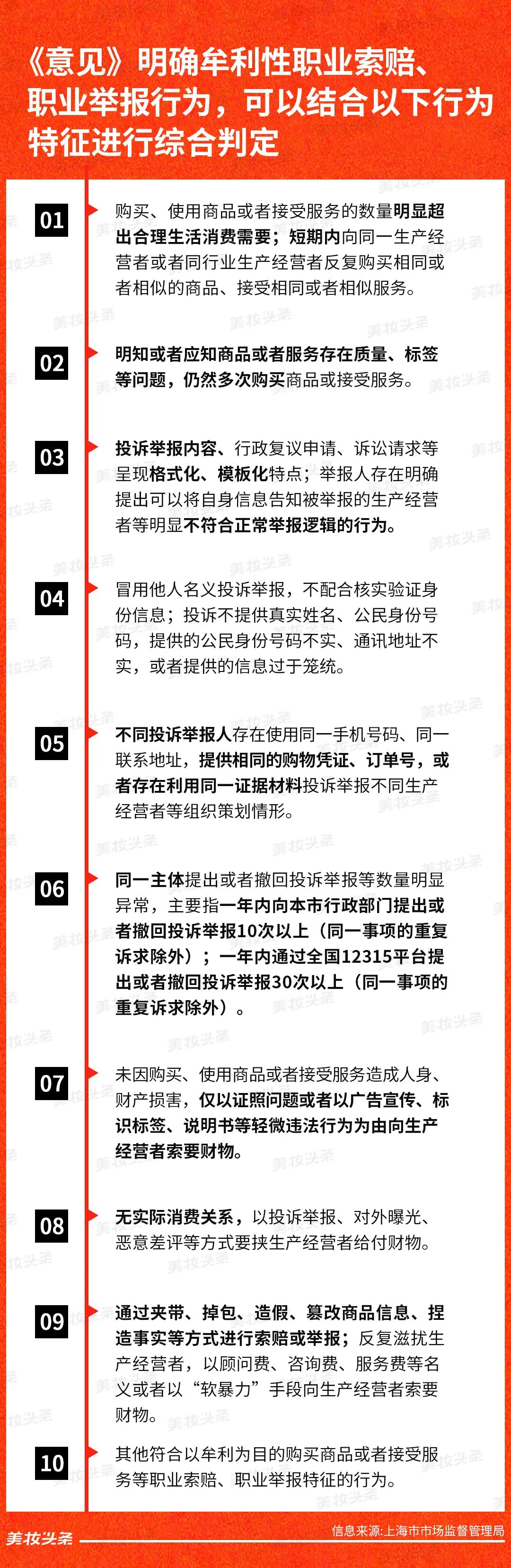 其中,《意见》第四条详细列举了判定牟利性职业索赔、职业举报的十项特征。