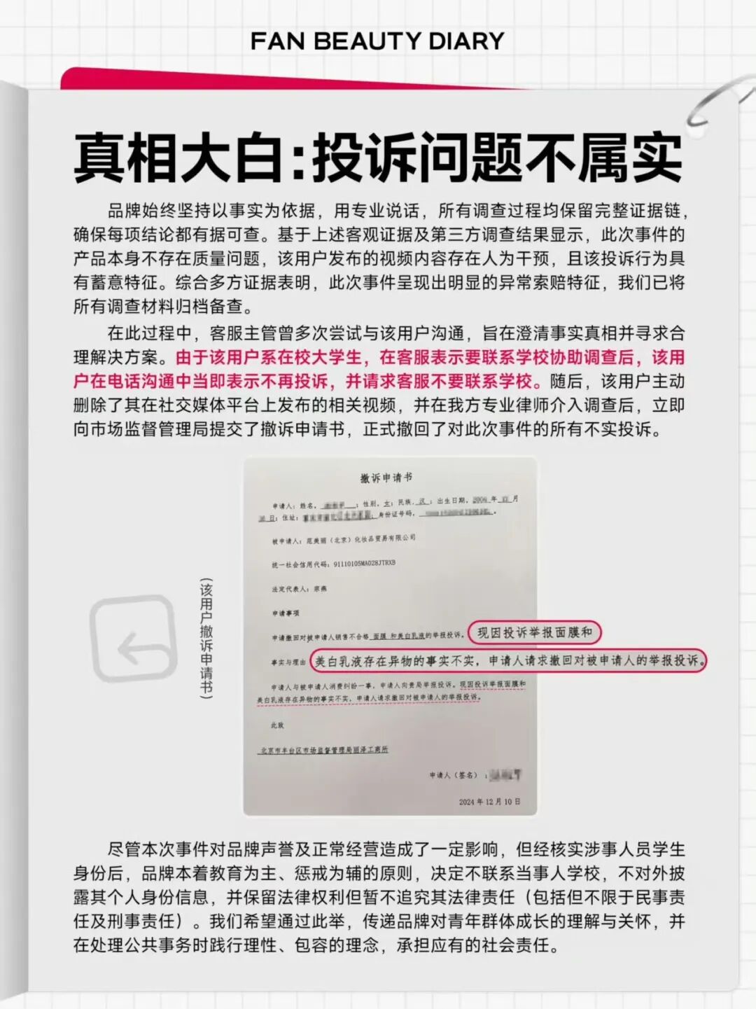 比如,今年八月,Fan Beauty Diary品牌创始人范冰冰发布视频表示,品牌在2024年8月至12月期间,遭到同一用户以“面膜内有异物”为由,累计索赔24735.3元。后虽经多方验证,该事件系蓄意索赔事件,但品牌仍受到相关舆情影响。