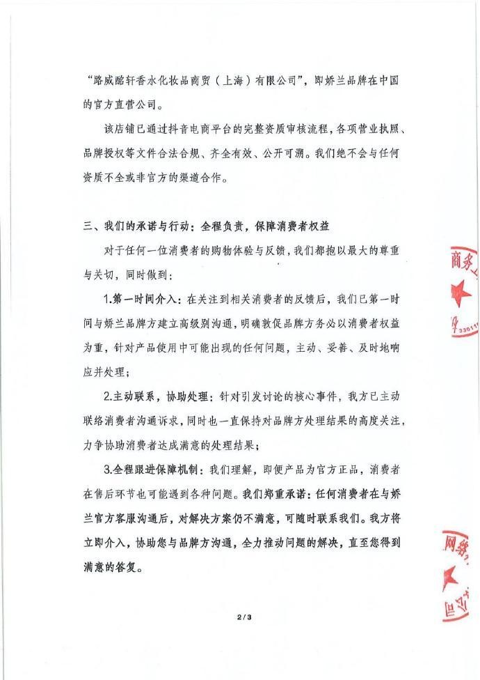 他们进一步说明,该店铺的运营主体为路威酩轩香水化妆品商贸(上海)有限公司,是娇兰品牌在中国的官方直营公司,绝不会与任何资质不全或非官方的渠道合作。