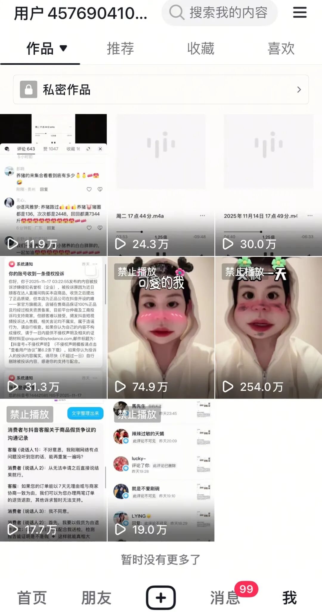 目前,该消费者的视频均被举报下架,账号功能受到限制,私信功能被封禁。