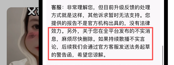 此外,平台客服称“用户提供的第三方报告无法律效力,无法支持其他诉求”,更明确要求消费者“尽快删除全平台相关视频,若持续散播不实言论,后续会发送法务起草警告函”。