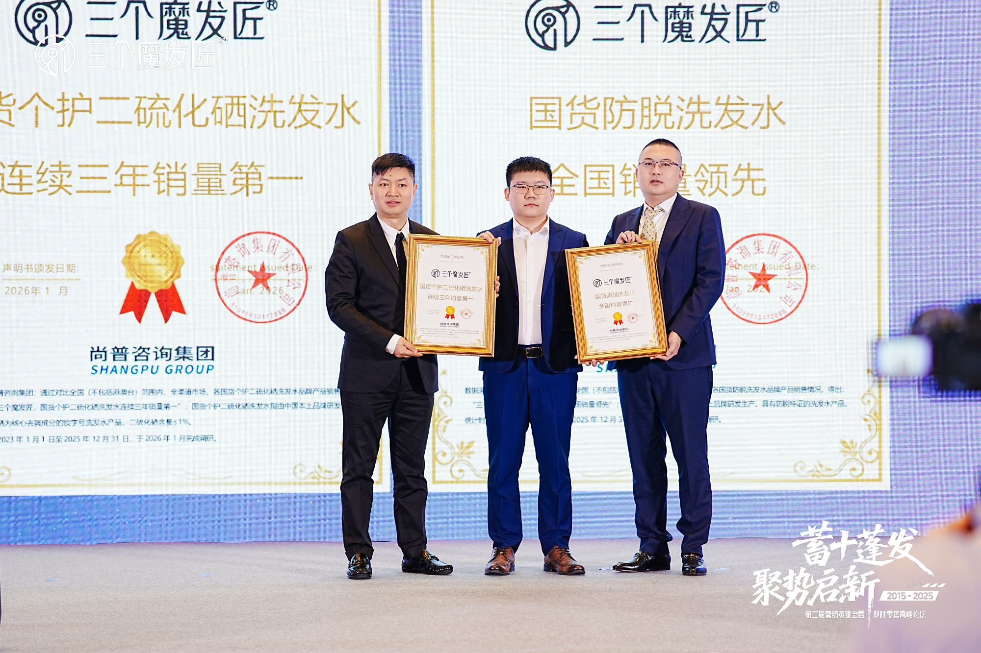 自2015年创立至今,三个魔发匠已逐渐在功效洗护赛道站稳脚跟。其核心产品二硫化硒洗发水获尚普咨询认证“国货个护二硫化硒洗发水连续三年销量第一”,2023年-2025年全渠道累计销售2298万瓶/支/袋;防脱洗发水2025年全渠道销量突破706万瓶/支/袋,同样获得“国货防脱洗发水全国销量领先”认证,备受市场与消费者认可。