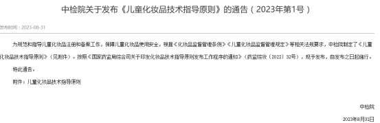 2023年8月31日,《儿童化妆品技术指导原则》发布,明确将儿童化妆品细分为两类:0~3周岁的婴幼儿及3~12周岁的儿童,并对功效宣称进行严格限定。
