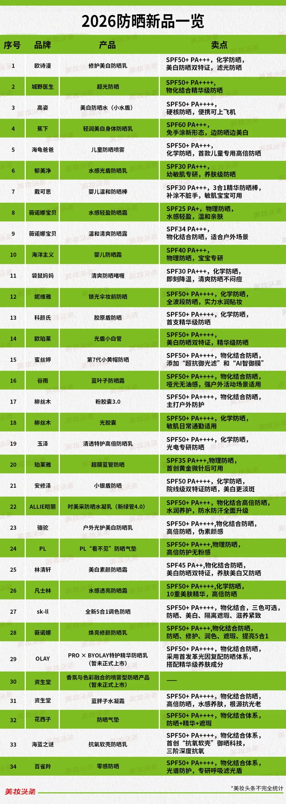 据不完全统计,截至3月3日,国内外已有30+品牌抢先入局,密集推出防晒新品。从新锐国货到高端大牌,从前沿技术到专研成分,透过这些新品,2026年的防晒风向已清晰可感。