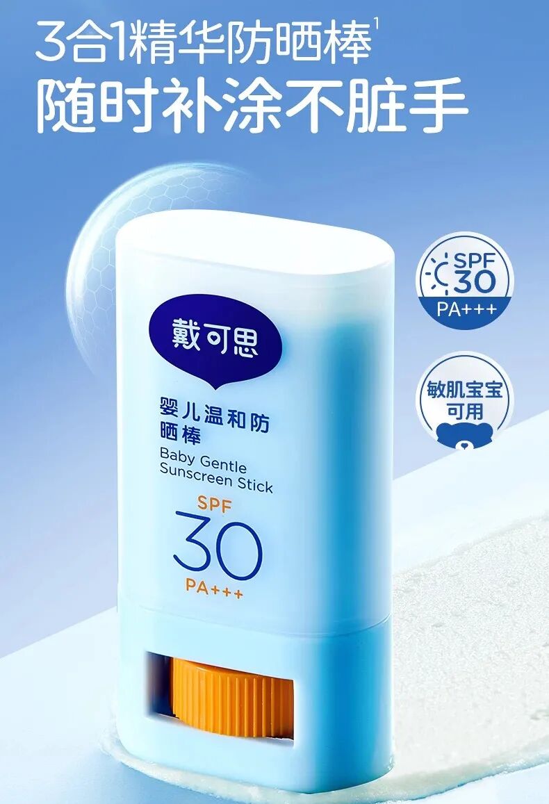 戴可思也推出婴儿温和防晒棒,打出“3合1精华防晒棒,补涂不脏手”的卖点。