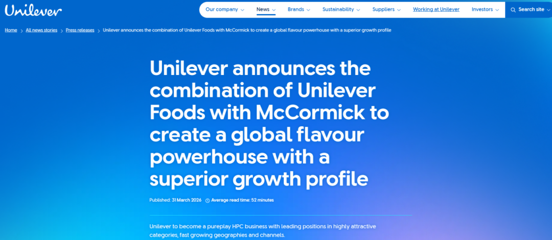 近日,这家百年快消巨头在官网正式官宣,将旗下食品业务与美国调味料企业味好美(McCormick&Co.)合并,交易额达448亿美元(约合人民币3072.12亿元)。