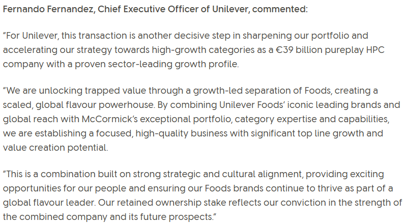 针对将旗下食品业务与美国调味料企业味好美合并,联合利华首席执行官费南多·费尔南德斯表示,“对联合利华而言,本次交易是我们优化业务组合、加速战略转型的关键一步。转型后,我们将成为年营收390亿欧元(约合人民币3109.55亿元)的单一主业家居与个人护理企业,拥有行业领先的增长业绩。”
