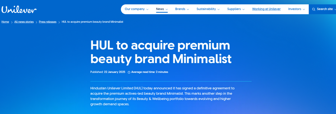 2025年更是联合利华在美妆领域的收购大年。1月,联合利华官网发布公告,宣布印度分公司已签署最终协议,以295.5亿卢比(约合人民币21.84亿元)收购印度高端美容品牌Minimalist,该交易预计将2026财年第一季度完成。同月,联合利华还领投了印度高端护肤品牌Ras Luxury Skincare。6月,联合利华再次出手,与美国私募基金Summit Partners签署协议,计划收购男士个护品牌Dr.Squatch,据悉该品牌估值已达20亿美元。