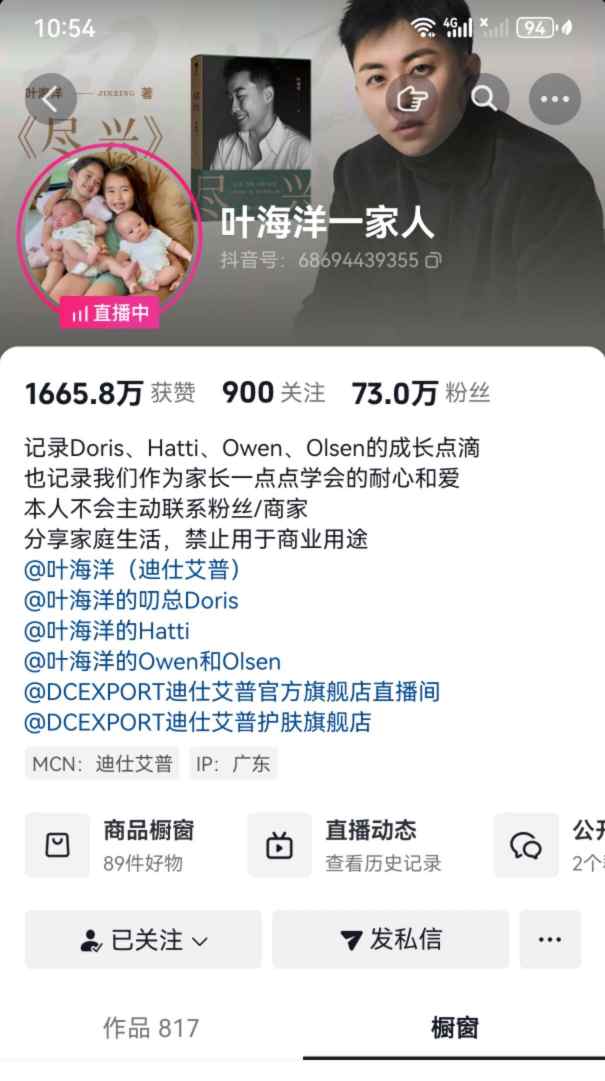 比如,迪仕艾普的爆发就和创始人IP分不开。在抖音平台,叶海洋作为一位单身母亲与创业者,通过精准的内容定位成功塑造了与女性群体深度共鸣的个人品牌形象。她持续分享自己的创业历程、产品专业知识及育儿感悟等多元内容,获得了广泛关注。除了个人主账号(粉丝854万+)之外,叶海洋大女儿Doris(粉丝89万+)、二女儿Hatti(粉丝120万+)以及双胞胎儿子(粉丝62万+)都有自己的社交媒体账号,并开启直播带货。