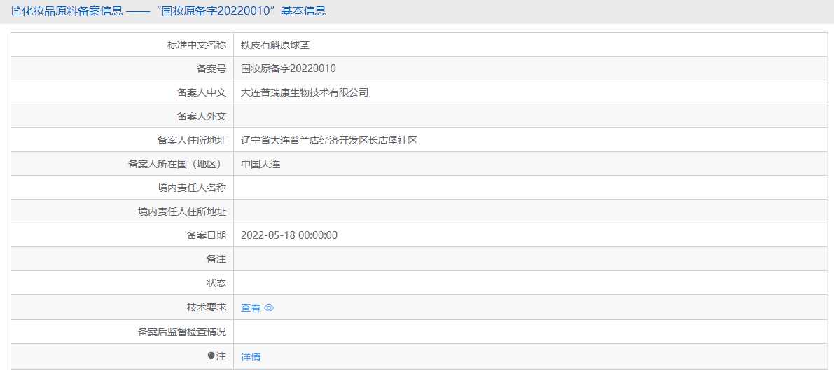 近日,据国家药监局化妆品原料备案信息平台显示,又一新原料“铁皮石斛原球茎”完成备案,备案人为大连普瑞康生物技术有限公司。