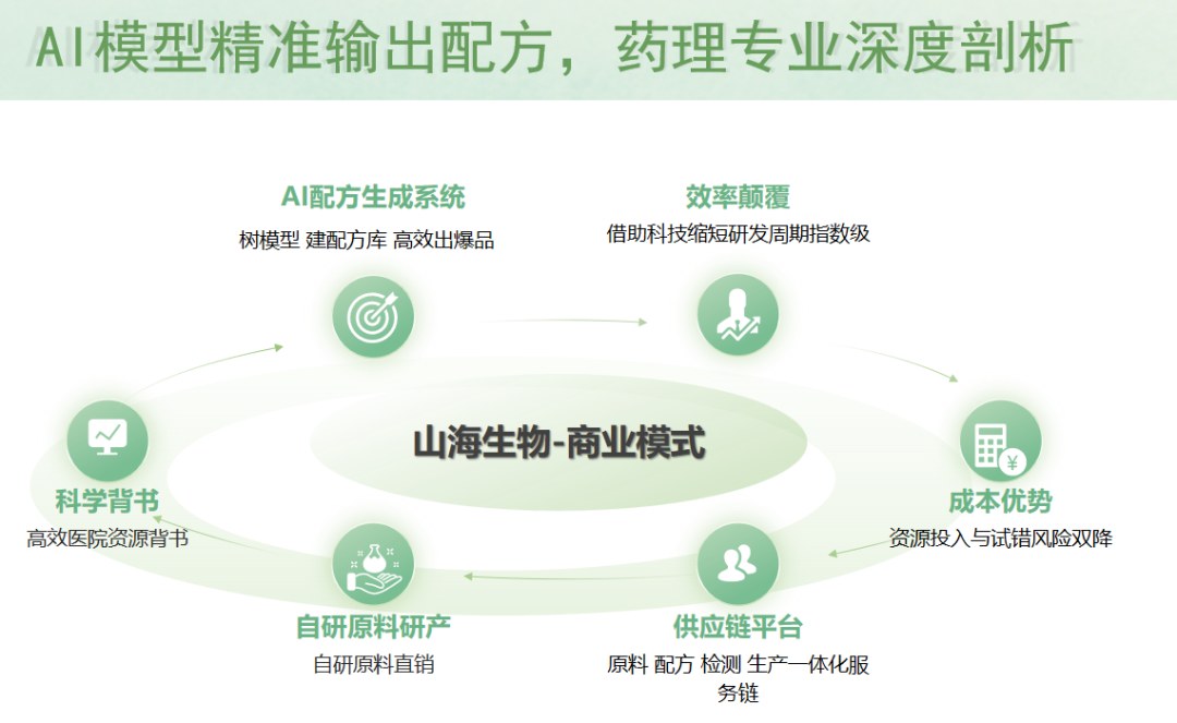 山海生物的AI大模型,能够根据客户的功效需求,反向推导最优配方解决方案,通过“干实验(AI建模)+ 湿实验(实际检测)”的循环,不断验证并优化模型,为客户提供从AI配方服务到供应链整合,再到高毛利自研原料的全链条服务。
