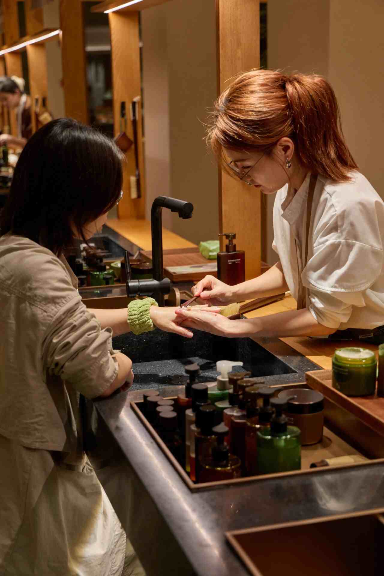「见个面」区域通过品牌自主策划的《身体新知》刊物与系列香氛产品,构建了一个关于浴室文化与身体哲学的阅读场域。「握个手」区域则巧妙地将产品体验融入一套完整的手部护理仪式中。「聊一聊」区域则以“浴室与自我”为主题的微型展览,进一步深化空间的情感连接功能。「下次见」区域取代了传统的收银区,用期待再次相遇的温暖寓意,打破传统交易完成后关系即告一段落的商业逻辑。