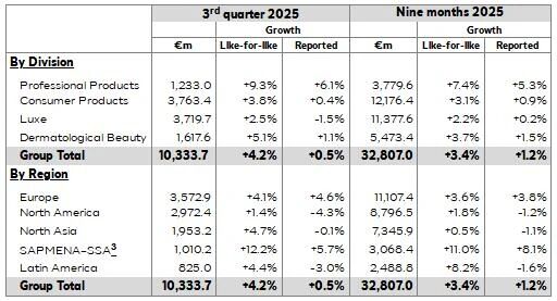 10月22日,欧莱雅中国资讯中心发布2025年截至9月30日的财报,欧莱雅的同比增长持续加速,第三季度达到了4.9%,销售额为103亿欧元;各事业部均实现增长,其中专业美发产品部增速最快,达到7.4%;各区域均实现增长,北美及中国大陆市场持续复苏提供强劲动能;线上渠道实现两位数增长,远超市场增速。