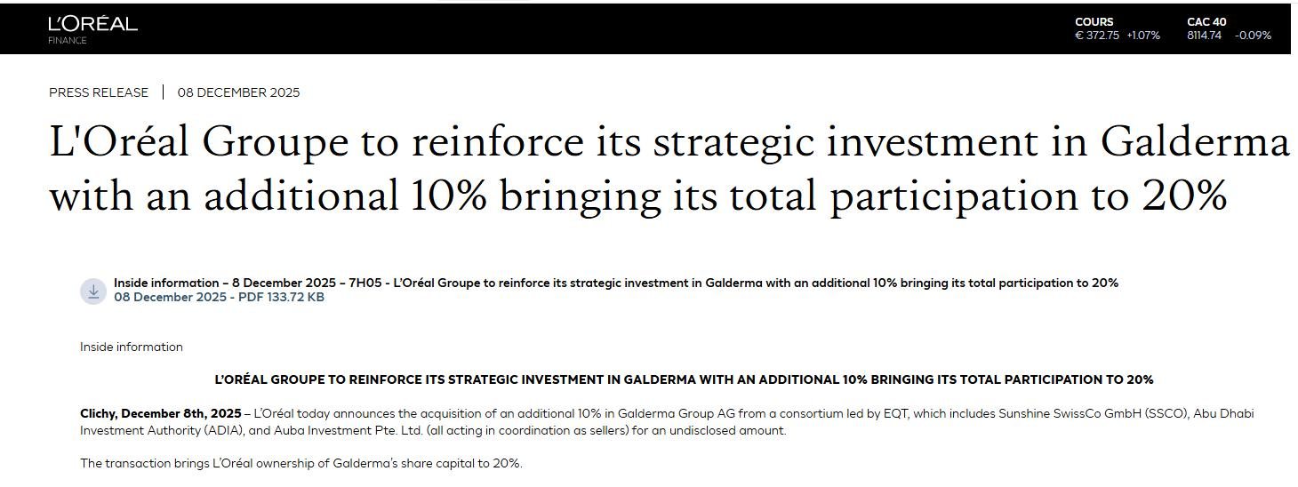 12月8日,欧莱雅集团宣布,将以未披露金额,从由EQT牵头的财团手中额外收购高德美10%股权。此次交易后,欧莱雅集团对高德美的持股比例增至20%。今年8月,欧莱雅集团收购了高德美10%的股份。