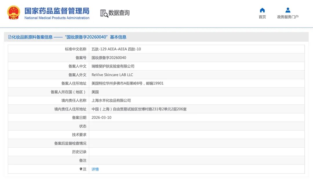 近日,瑞维斐护肤实验室有限公司(ReVive Skincare LAB LLC)的五肽-129 AEEA-AEEA 四肽-10完成新原料备案,备案号为“国妆原备字20260040”,境内责任人为上海水羊化妆品有限公司。据悉,瑞维斐护肤实验室有限公司位于美国特拉华州,是美国品牌瑞维斐(RéVive)的相关主体公司之一,瑞维斐由著名整形外科医生Gregory Brown博士创立,专注于高端功效护肤品研发与销售。。