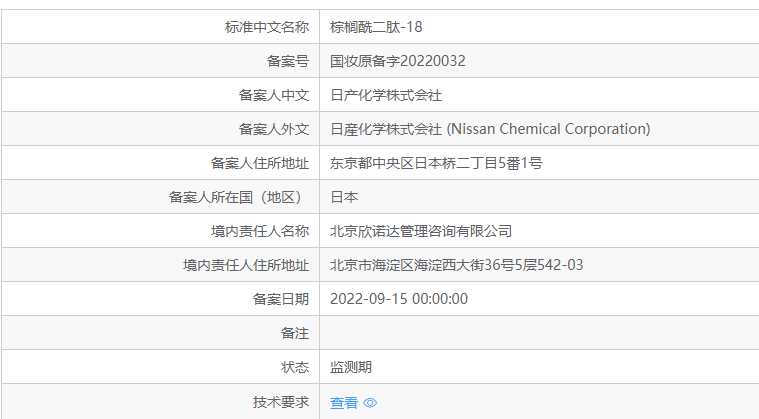 日产化学株式会社备案的原料名称为 “棕榈酰二肽 -18 ”,原料使用目的为增稠剂,适用于各类化妆品,对使用范围无特殊限制,安全用量为≤ 2% ,功能有效量不低于 0.5% ,纯度不低于 95% 。