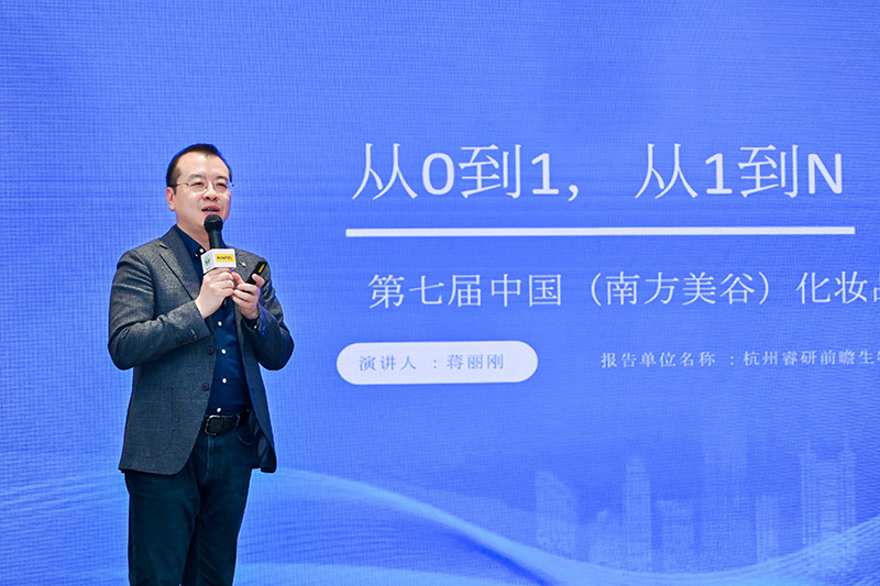 随后,杭州睿研前瞻生物科技有限公司总经理、前珀莱雅化妆品股份有限公司首席研发官蒋丽刚在主题报告中,从珀莱雅探索大单品之路的历史,迄今为止的发展,和未来的可能,提出品牌从0到1完成后,如何继续1到N的成功、持续产出的产品创新平台搭建的建议;并从“科技赋能”,是新媒体热炒的成功“独木桥”,探索品牌该如何理性“跳出困境”。