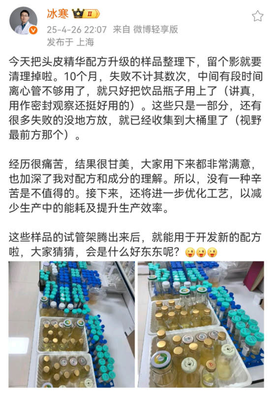 相较于当下行业盛行的“概念炒作”,冰寒的科研路径显得格外“另类”。他的实验室始终坚持先解决问题,再谈转化的逻辑。以他担任首席科学家的中国原创细胞级头皮护理品牌“发现者”为例,品牌成立至今仅推出一款头皮精华产品,却凭借扎实的功效和良好的口碑,赢得用户的高度认可,回购率超过50%。