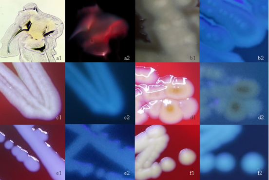 不同微生物在可见光和紫外荧光下的照片: a2示痤疮丙酸杆菌发出红色荧光 | 图源:冰寒老师公众号