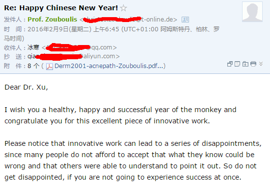 冰寒老师论文发表后,全球痤疮研究巨擘C. C. Zouboulis教授致信鼓励:不要因为自己的论点未被认可而失望,因为成功从来不是一蹴而就的 | 图源:冰寒老师知乎账号
