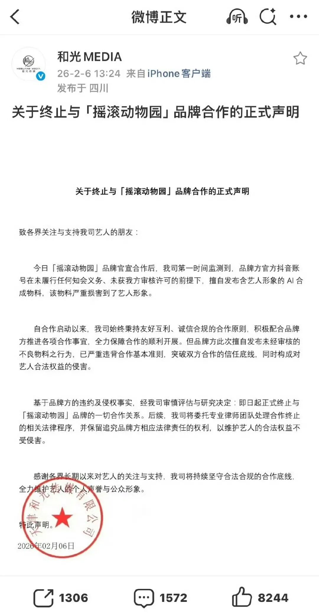 就在官宣代言不足四小时,代言人方经纪公司何光MEDIA在微博发布一纸《关于终止与「摇滚动物园」品牌合作的正式声明》,指出品牌擅自发布未经审核的含艺人形象的AI合成物料,严重损害艺人形象,违背合作基本准则,损害艺人合法权益,并宣布即日起正式终止与品牌的一切合作。