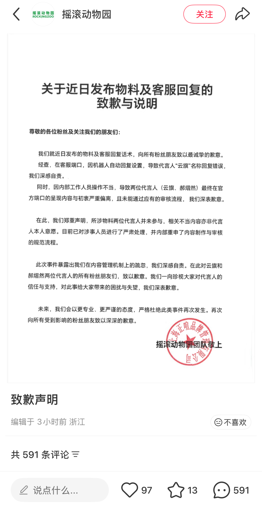 面对艺人经纪公司的强硬指控,摇滚动物园迅速发布声明,试图将负面影响降到最低。然而,声明中将AI低俗物料问题归咎于“内部工作人员操作不当”,客服错误话术则解释为“机器人自动回复设置”,这种避重就轻的态度反而二次激怒了粉丝。大量网友指责品牌方道歉对象只有粉丝,未对艺人有所表示,缺乏基本的尊重与诚意。