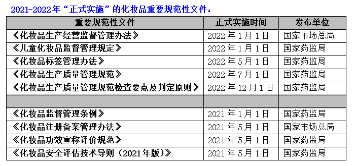 2022年,又有至少5条化妆品重要规范性文件“正式实施”。2021年、2022年国家药监局、国家市场总局连续出台、实施的化妆品重要规范性文件囊括监督管理、注册备案、功效宣称、安全评估技术、生产经营、儿童化妆品监督、标签管理、质量管理、检查要点等。这些“正式实施”的化妆品重要规范性文件,让中国美妆人继续戴着“枷锁”起舞: