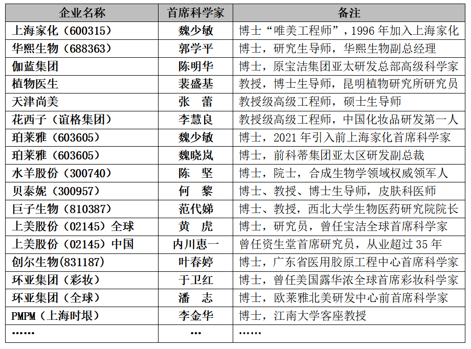 美妆头条根据以往和2022年中国本土美妆企业新闻宣传,梳理出曾经设置过及现在设置了“首席科学家”的主要企业如下(不完全统计):