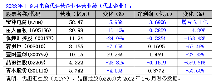 2022年,美妆行业的“寒气”正在传递到电商代运营企业。根据2022年前三季度(或上半年)披露的财报显示,美妆代电商运营企业集体“遇寒”,如丽人丽妆、若羽臣等美妆代运营企业都出现营收、净利润双双下滑,市值大幅缩水,甚至遭遇股东相继减持。