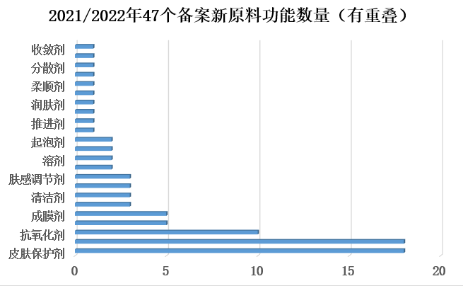 在通过的47个化妆品新原料备案中,TOP5“功能”原料为(有重叠):皮肤保护剂18个 、保湿剂18个、抗氧化剂10个、发用调理剂5个、成膜剂5个。