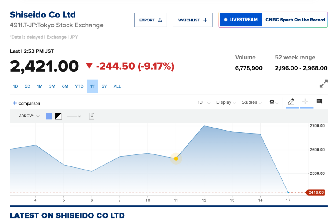 美国消费者新闻与商业频道(CNBC)给出的日本资生堂的股价走势图更是直观地显示,自14日起,这家日本企业的股价出现了断崖式的下跌。