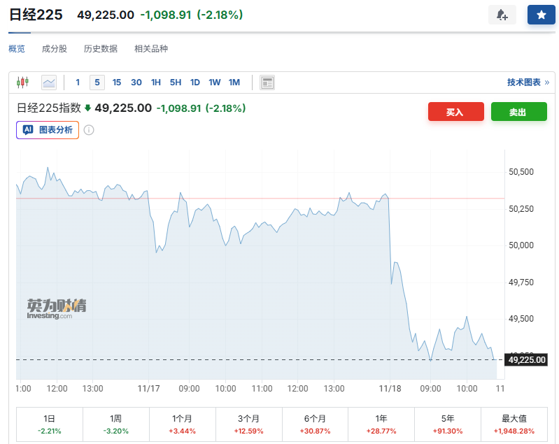 非常依赖中国游客的日本资本市场对此反应迅速而激烈。11月17日,日经225指数开盘即“跳水”,一度跌超1%跌破50000点。11月18日,日本消费股继续下跌,但下跌趋势有所缓和,资生堂跌超2%,高丝跌0.69%,POLA维稳,花王涨0.38%。