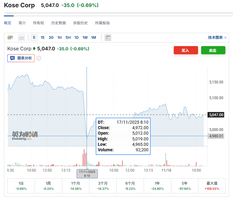 同为日企的高丝(KOSE)集团也在此时备受打击,18日股价跌超1%。在过去,高丝非常依赖中国市场。然而,从2023年开始,其在中国市场的表现开始遭遇严峻挑战。