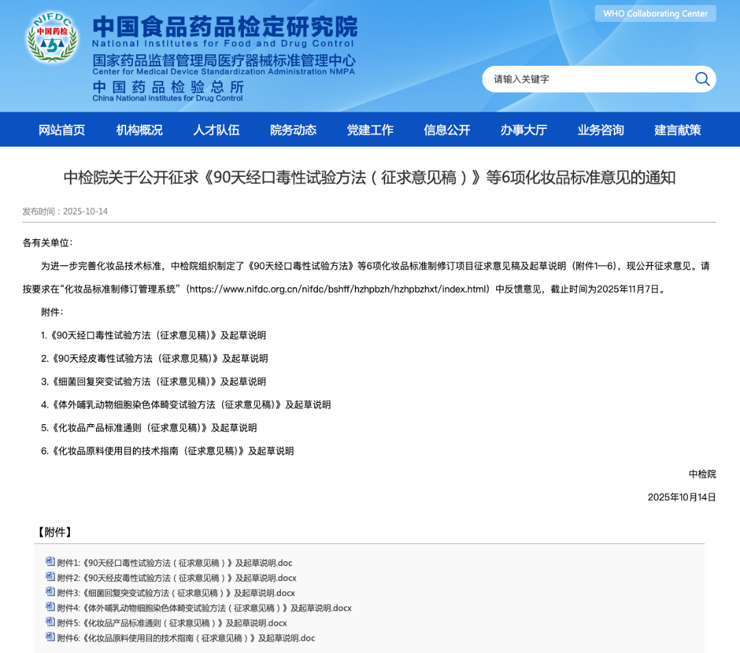 10月14日,中检院组织制定了《90天经口毒性试验方法》等6项化妆品标准制修订项目征求意见稿及起草说明,并公开征求意见。据悉,上述多项化妆品标准意见反馈平台为“化妆品标准制修订管理系统”,截止时间为2025年11月7日。