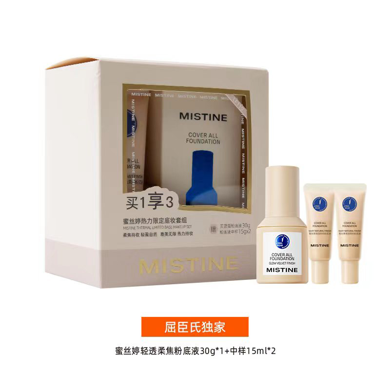 值得一提的是,针对该渠道,Mistine蜜丝婷还特别推出了独家专供的粉底液套盒,该套盒包括了蓝盾Pro粉底液+15ml粉底液小样*2。